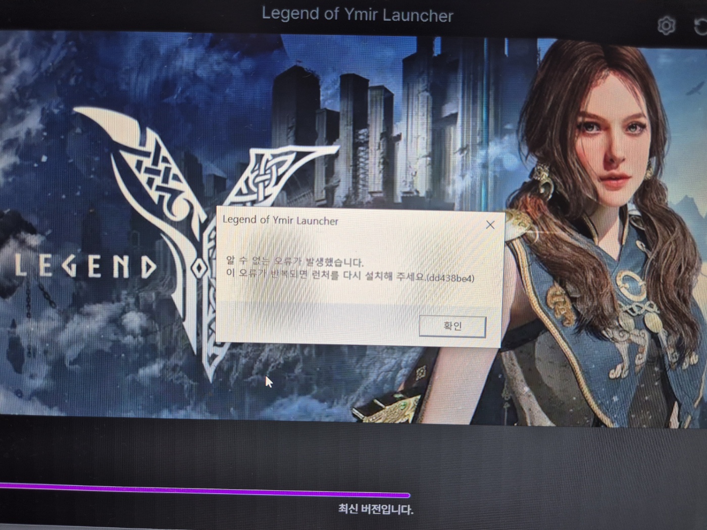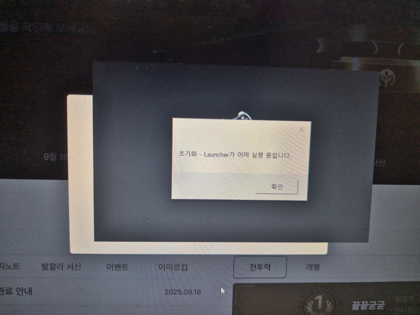 ㆍ점검 전까지 게임을 하다 점검. 업데이트후 "초기화 - Launcher가 이미 실행 중입니다." 안내창 뜸. 이미르 삭제후 재설치했으나 "알 수 없는 오류가 발생했습니다. 이 오류가 반복되면 런처를 다시 설치해 주세요(ddd438be4) 안내문구 뜸.