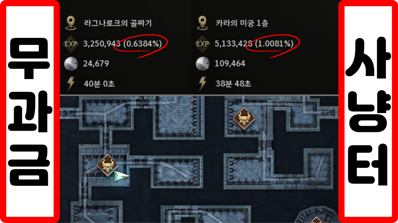 라그나로크 골짜기 40분 사냥 0.63% 경험치 흭득 → 카라의 미궁 40분 사냥 1% 경험치 흭득