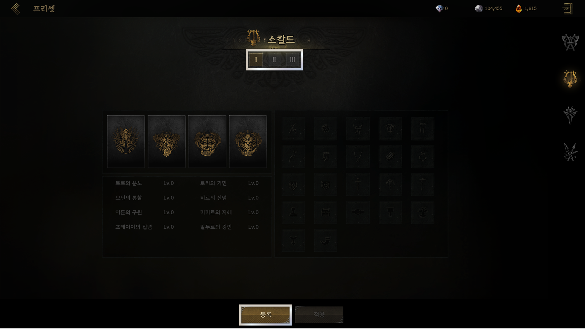 - 상단의 I~III 슬롯 중 원하는 슬롯을 선택하고, [등록] 버튼을 눌러 현재 캐릭터 내 캐릭터 상태 정보를 저장할 수 있습니다.