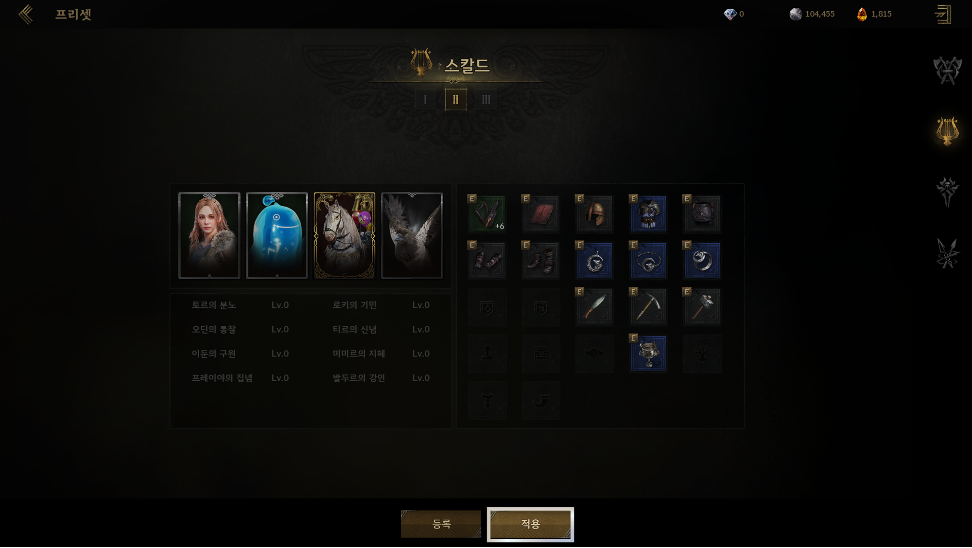 현재 캐릭터의 착용 장비, 디시르, 발키리, 동반자(지상, 공중), 포텐셜 설정 등의 설정 정보를 빠르게 저장 및 적용할 수 있는 기능입니다.