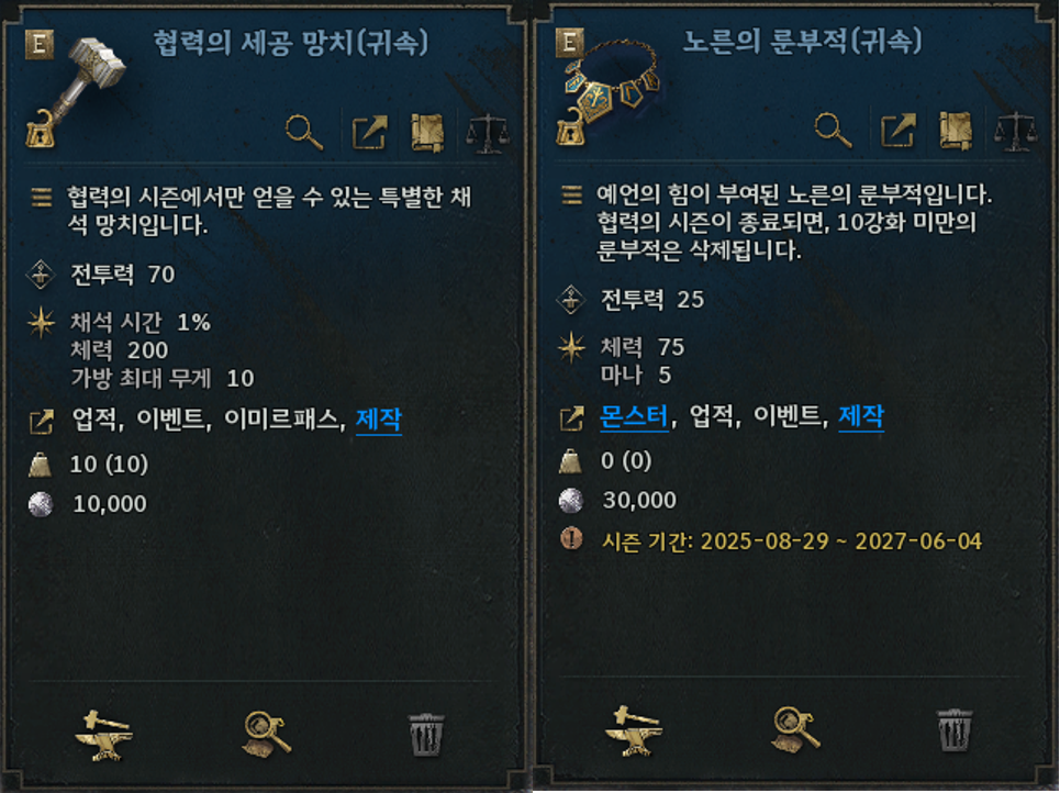 시즌 장비 ‘노른의 룬부적’과 ‘협력의 세공 망치’를 획득해 컬렉션에 등록하거나 강화에 활용할 수 있습니다