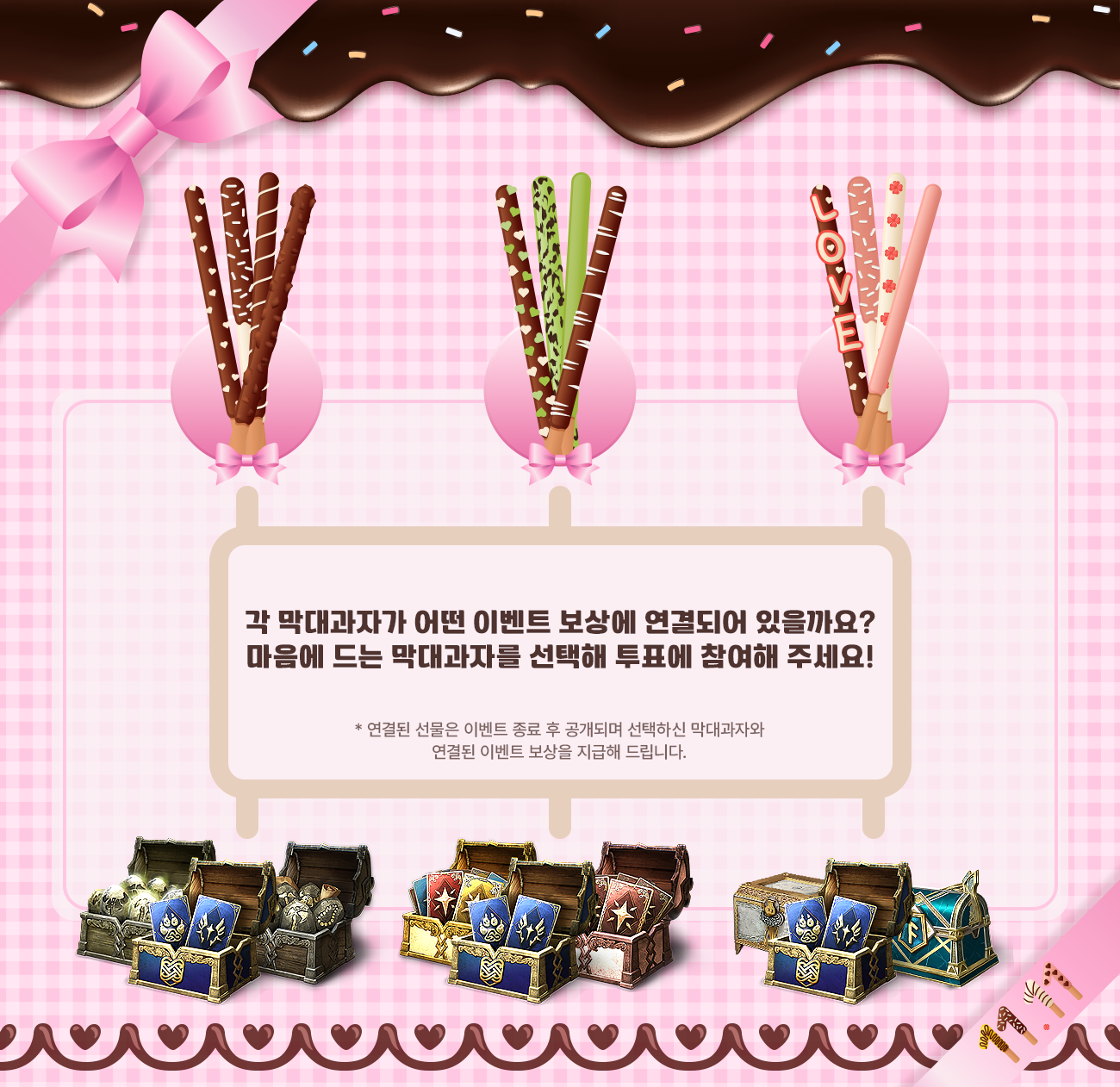 - 이벤트 내용: 주어진 이미지 속 마음에 드는 막대과자를 선택해 투표해 주세요. 이벤트 종료 후 선택하신 막대과자에 연결된 선물을 지급해 드립니다.