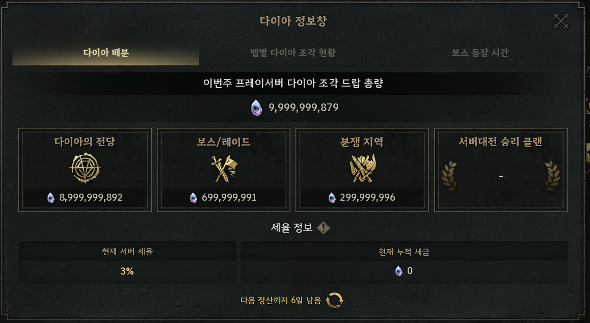 - 다이아 조각 드랍 시, 서버의 세율에 따라 인터서버의 모든 세금이 누적되며 누적된 세금은 서버대전 승리 클랜원들에게 다음 주 목요일 정산시 우편으로 분배됩니다.