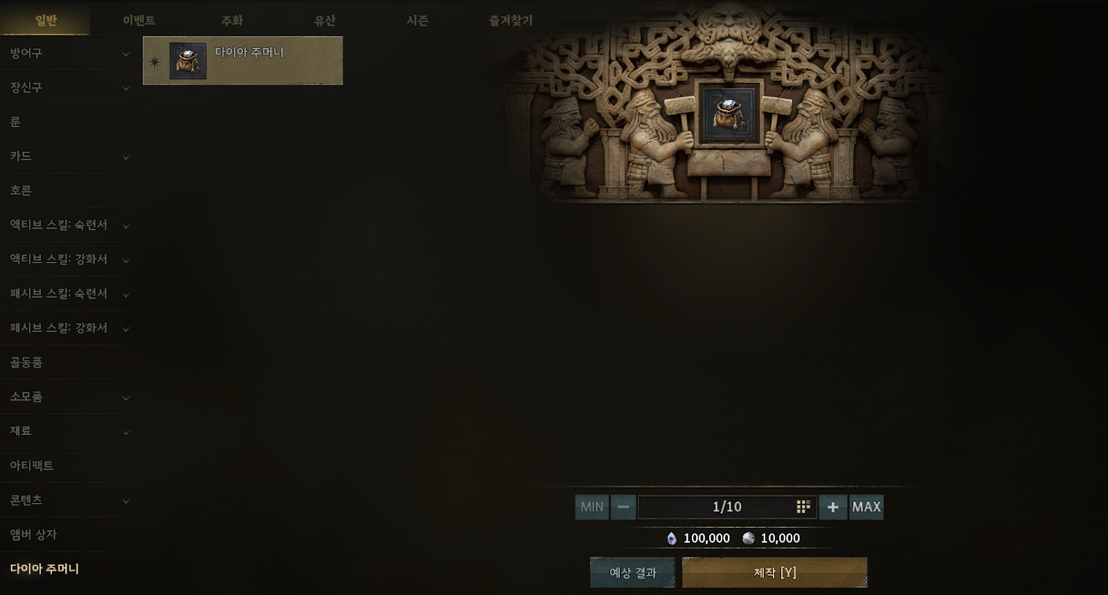 - 인터 사냥을 통해 획득한 다이아 조각은 [제작] > [일반] > [다이아 주머니]에서 제작을 통해 다이아로 전환할 수 있습니다.