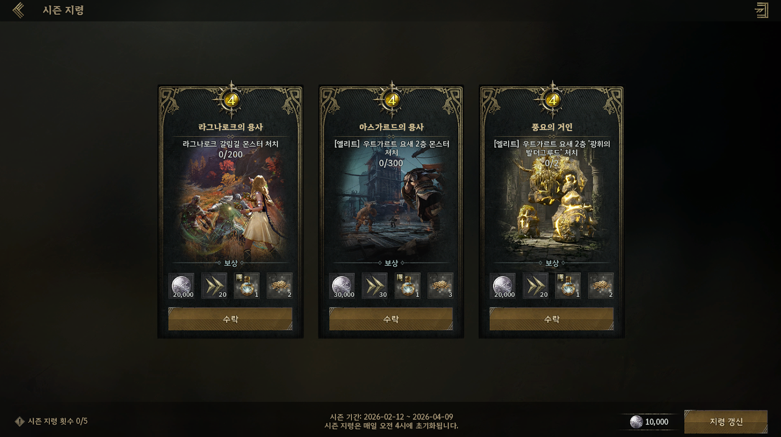 - 시즌 기간 동안 매일 오전 4시에 지령이 초기화됩니다.