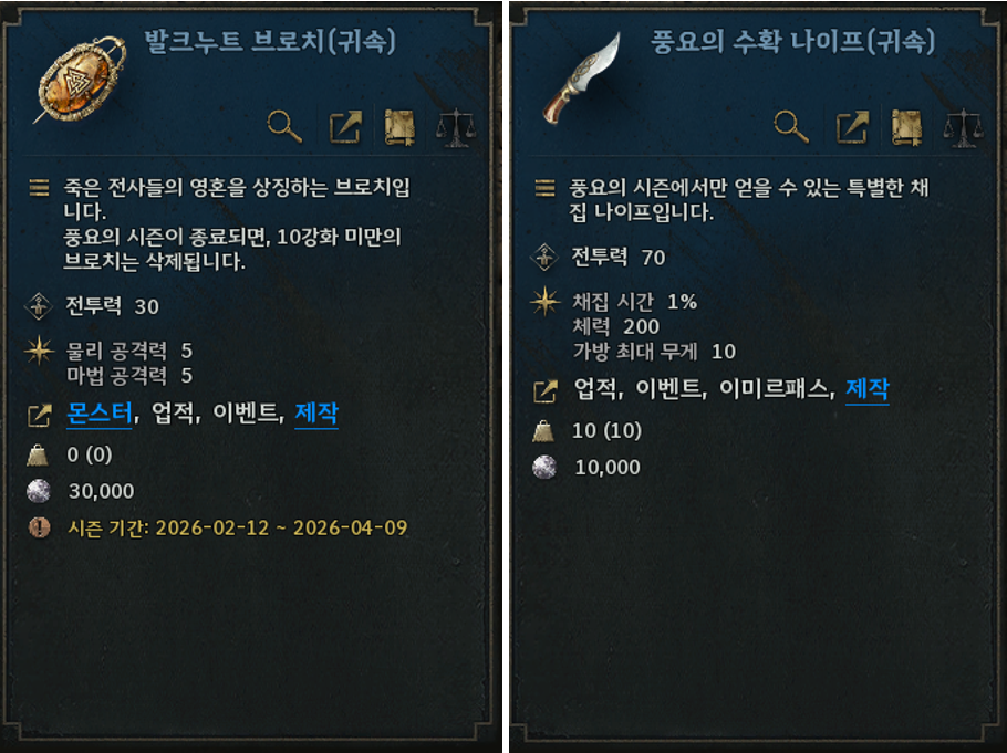 시즌 장비 '발크누트 브로치'와 '풍요의 수확 나이프'를 획득해 컬렉션에 등록하거나 강화에 활용할 수 있습니다.