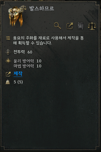 - 발스하므르는 [제작] > [주화] > [풍요의 주화]에서 제작할 수 있습니다.
