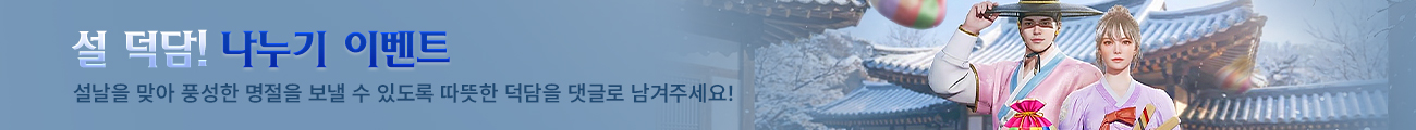 - 이벤트 내용 : 설날을 맞아 함께 모험을 이어가는 전사님들께 전하고 싶은 따뜻한 덕담을 댓글로 남겨주세요! 참여해 주신 전사님들 중 추첨을 통해 10명에게 구글 기프트 카드 3만 원권을 선물로 드립니다.