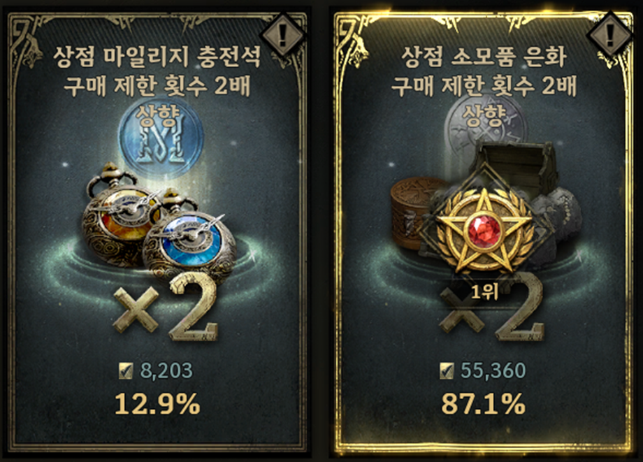 ㆍ[투표 결과 반영] 상점에서 은화로 구입하는 소모품 상품의 구매 제한이 일주일간 2배로 상향됩니다.