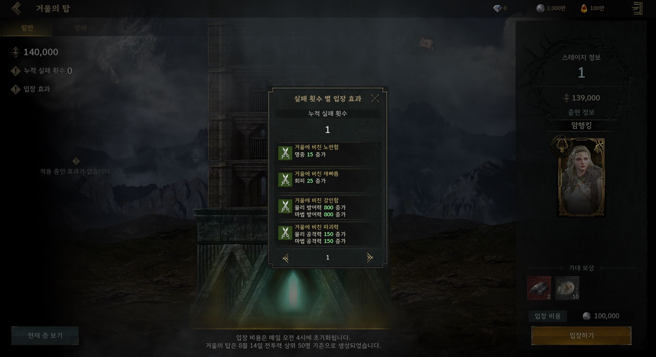 ㆍ[거울의 탑] 거울의 탑에 실패 횟수에 따른 버프 정보를 확인할 수 있는 정보창이 추가됩니다.