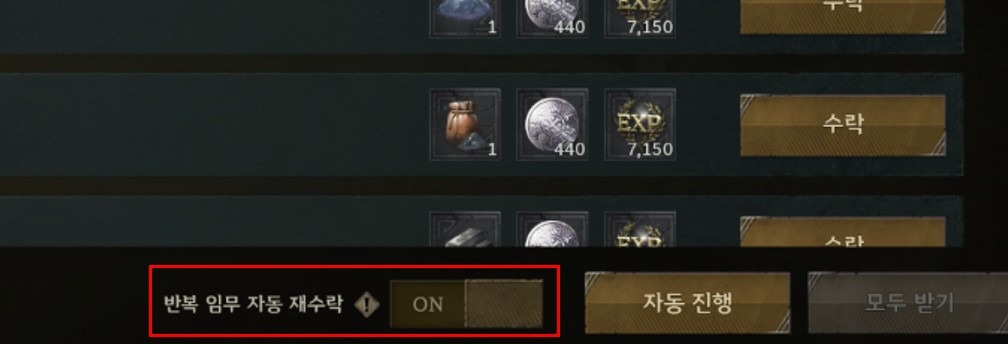 - 옵션을 ON 으로 설정한 뒤, 퀘스트 수행 구역에서 ‘자동 전투’를 진행하면 반복 퀘스트 진행 횟수만큼 자동 재수락되어 플레이할 수 있습니다.
